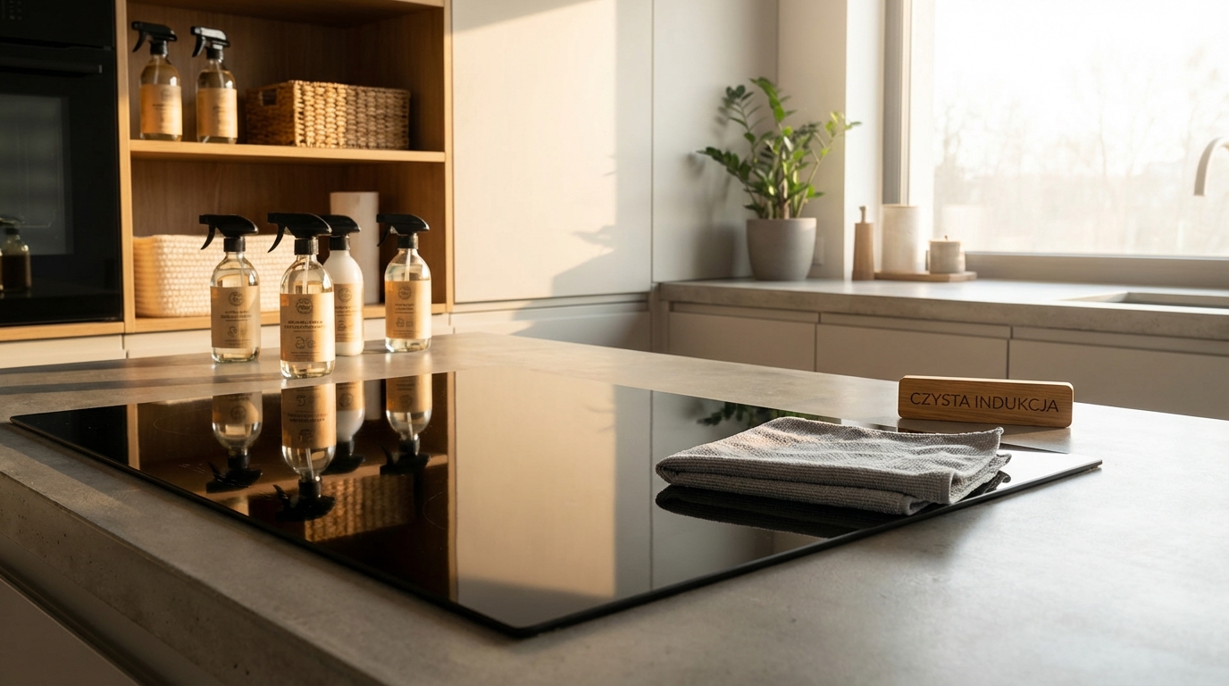 Płyn do szyb lub specjalny środek do płyt indukcyjnych zapewnia skuteczne usuwanie tłuszczu. Unikaj uniwersalnych sprayów – mogą pozostawiać smugi.
