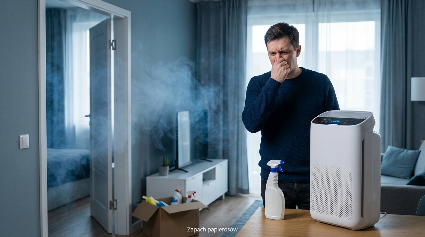 Postaw go w miejscu, gdzie zapach jest najsilniejszy (zwykle przy ścianie dzielącej z sąsiadem). Nie zasłaniaj wlotów powietrza, zachowaj 50 cm odstępu od ścian. Musisz pamiętać o regularnej wymianie filtrów: HEPA co 6-12 miesięcy, węglowy co 3-6 miesięcy (w zależności od intensywności użytkowania).